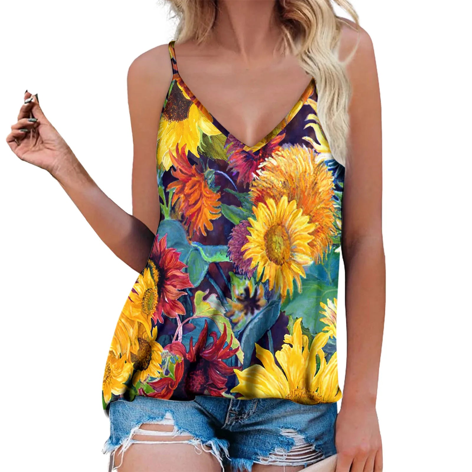 Women Casual Summer V-Neck Camis Top Sunflower Printed Blouse Spaghetti Strap Camisole Top